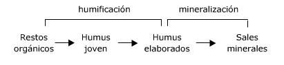 Los restos orgánicos no se mineralizan directamente sino que van transformándose en compuestos orgánicos cada vez más sencillos (humificación) hasta convertirse en moléculas inorgánicas. El conjunto de compuestos húmicos forma el humus de color negro.