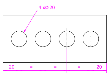 En la imagen de la izquierda las cuatro circunferencias quedan acotadas mediante la anotación del diámetro de una de ellas y la cantidad de circunferencias que comparten dicho diámetro (4 x ø 20).
