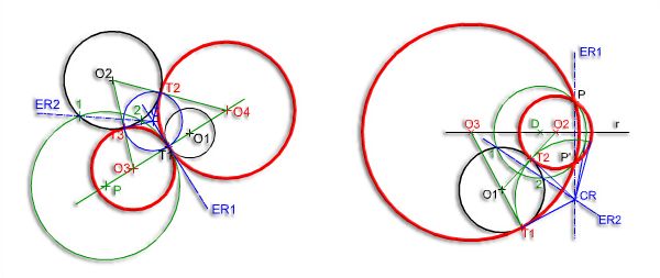 - La circunferencia mayor es secante al arco menor: el centro radical queda determinado mediante la intersección de la recta tangente a la semicircunferencia (ER1) y el eje radical (ER2) determinado por una circunferencia auxiliar.