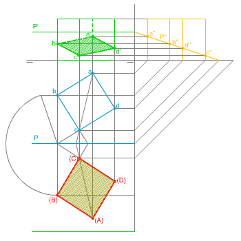 En la imagen izquierda te mostramos las proyecciones diédricas de un tetraedro, apoyado por una de sus caras en el PHP, seccionado por un plano oblicuo.
