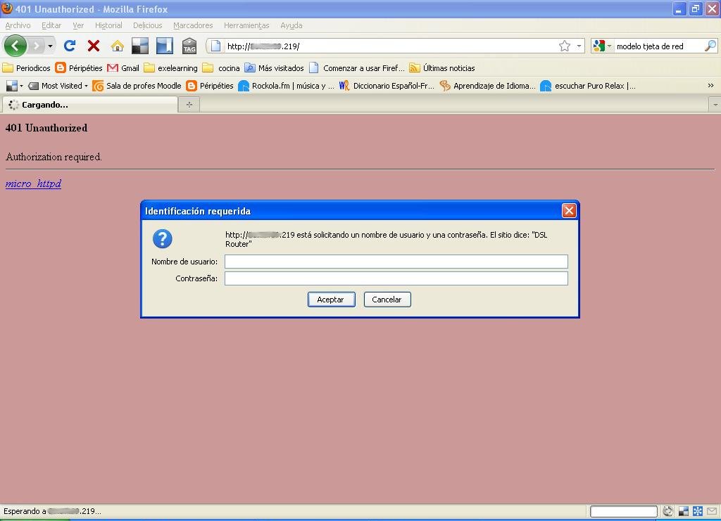 Para asegurarnos de que todo está correcto busca en cualquiera de los enlaces anteriores cual es tu IP Pública. Y desde el navegador escribe esa misma dirección IP. Debería abrirse una ventana pidiendo usuario y contraseña para el router, como en esta figura: (pincha para ampliarla)