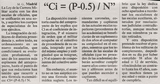Pero las fórmulas aparecen en nuestro entorno cotidiano en el momento más insospechado. En el siguiente recorte del periódico El País (20/11/2006), aparece una fórmula que se utiliza para organizar la movilidad dentro del escalafón militar, y con la que más adelante trabajaremos.