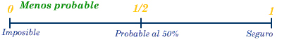 Recuerda del curso pasado que la probabilidad de que ocurriera un suceso se medía con un número comprendido entre 0 y 1, que si estaba cerca de 1 era más probable y cerca de 0, menos probable.
