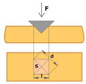 La dureza Vickers (HV Hard Vickers), se calcula de forma similar a como lo hacíamos en el ensayo Brinell. En este caso la dureza es función de la superficie lateral de la huella y de la carga aplicada.