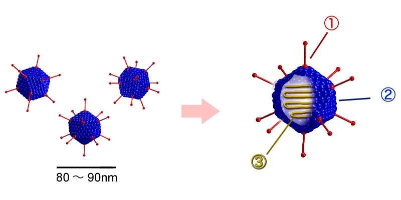 Las subunidades proteicas se colocan girando alrededor de un círculo formando un rulo. Si los rulos son superpuestos por giros sucesivos, a modo de espiral, se forma un tubo con espacio para el material genético.