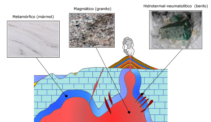 Yacimientos de origen metamórfico: En determinados momentos (movimientos orogénicos) las rocas del interior de la tierra son sometidas a elevadas presiones y temperaturas lo que provoca en ellas cambios mineralógicos y texturales importantes, sin llegar a fundirse, y grandes recristalizaciones que originan nuevas rocas como el mármol, que se forma por el metamorfismo de la caliza.