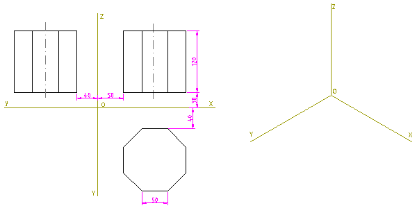 Vamos a dibujar en primer lugar en isométrica, un prisma recto de base hexagonal de acuerdo con las dimensiones y posición que se aprecia en la siguiente imagen.