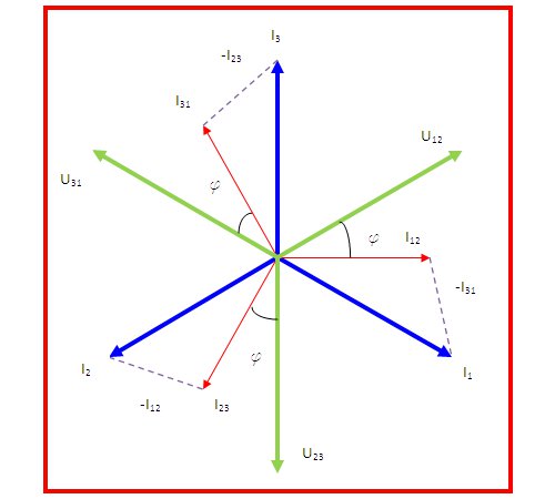 Cada intensidad de línea se encuentra retrasada 30º respecto de la intensidad de fase, como puedes observar si representamos vectorialmente las intensidades en una conexión de fuentes en triángulo: