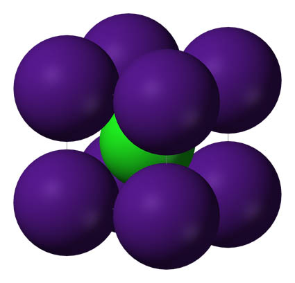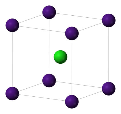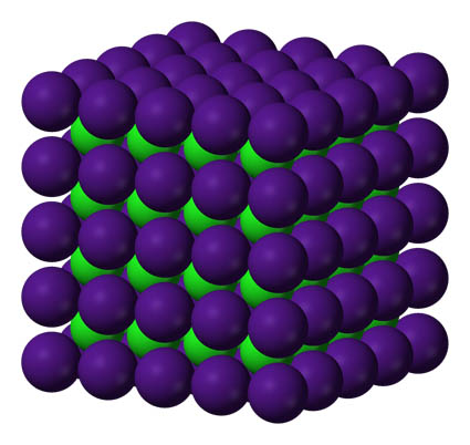 Fíjate en cómo se representan los diagramas de partículas de una sustancia iónica, el KCl. A la izquierda tienes la estructura de un trozo de sustancia, y en el centro y a la derecha, la unidad elemental que al repetirse da lugar a un cristal de KCl.