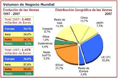 En las siguientes gráficas puedes observar los datos correspondientes al volumen de negocio realizado por la industria química en el mundo durante el año 2007, detallado para cada zona geográfica y en los distintos sectores consumidores: