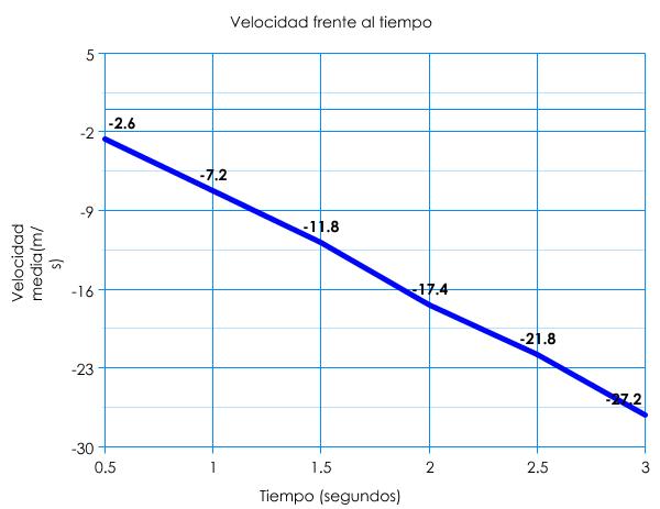 Observamos que la velocidad varía con el tiempo. ¿Qué significa ese signo negativo? Pues que nuestra bola se desplaza hacia abajo. Cada vez la rapidez de la bola es mayor (el valor de la velocidad sin tener en cuenta el signo).