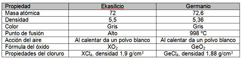 Observa que hay dos elementos, de masas atómicas 68 y 70, que se indican con un interrogante. Eran elementos desconocidos entonces, pero que se descubrieron pocos años después. Observa la tabla y fíjate en la precisión de las previsiones de Mendeleiev, basadas en la repetición periódica de las propiedades.